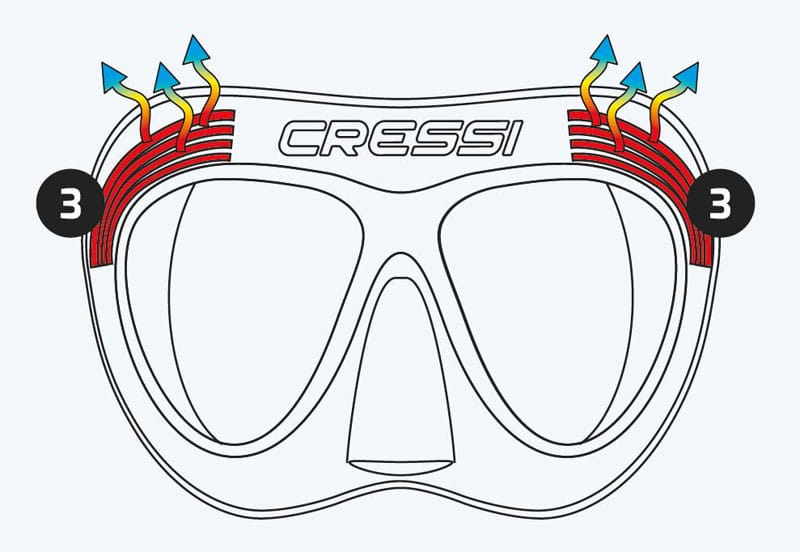 Maska Cressi Quantum posiada opatentowaną membranę otaczająca wewnętrzną kieszeń na nos i obie wewnętrzne kieszenie na oczy, która działa jak bariera i zatrzymuje wilgoć wydostającą się mimowolnie z nosa nurka podczas oddychania przez usta.