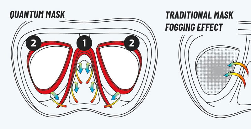 Główną innowacją maski Quantum jest to, że nie tylko zapewnia lepsze widzenie w dół, ale pozwala uniknąć zjawiska zaparowania, dzięki wewnętrznej termoregulacji ciepłego, wilgotnego powietrza wychodzącego z nosa.